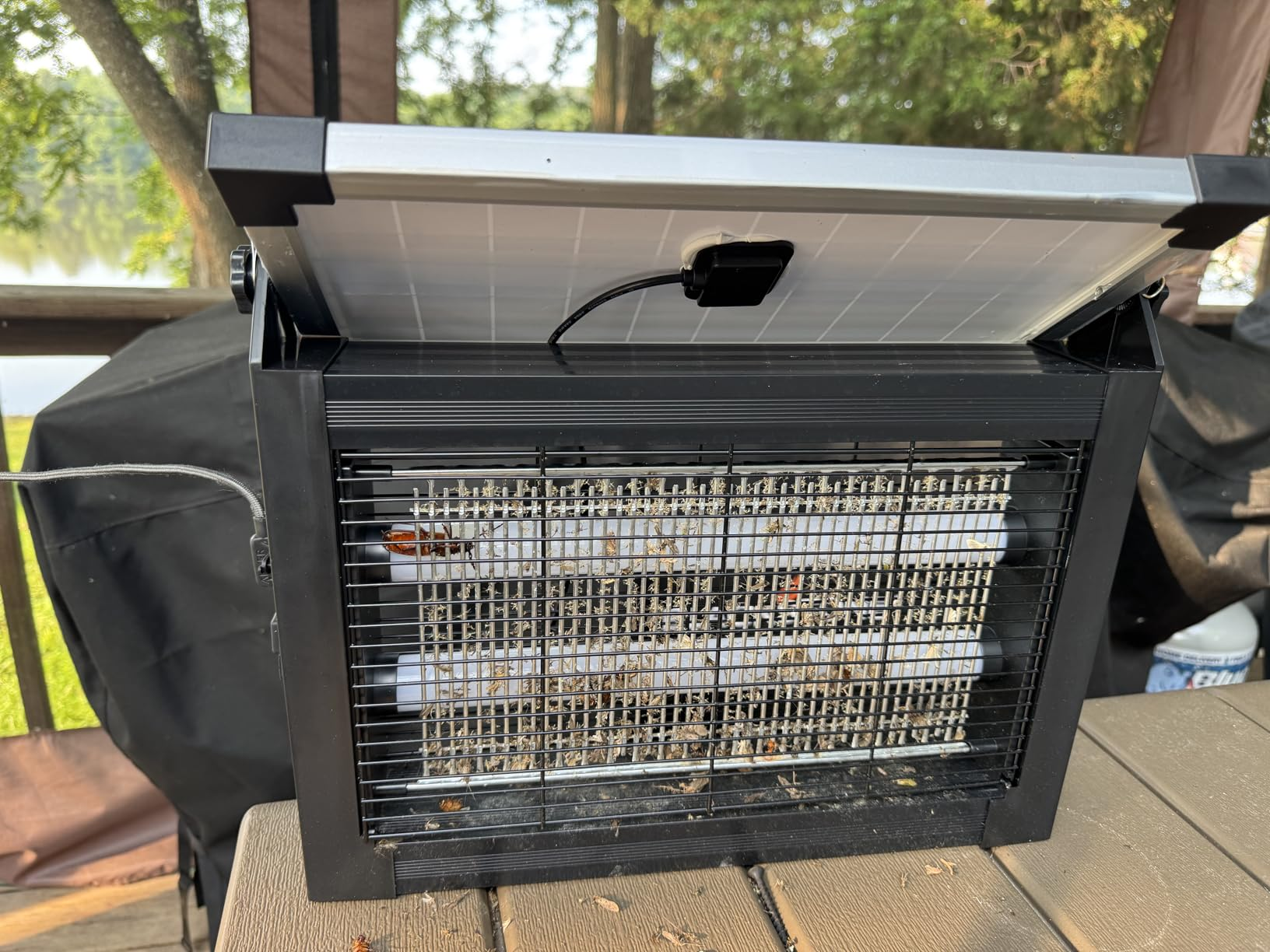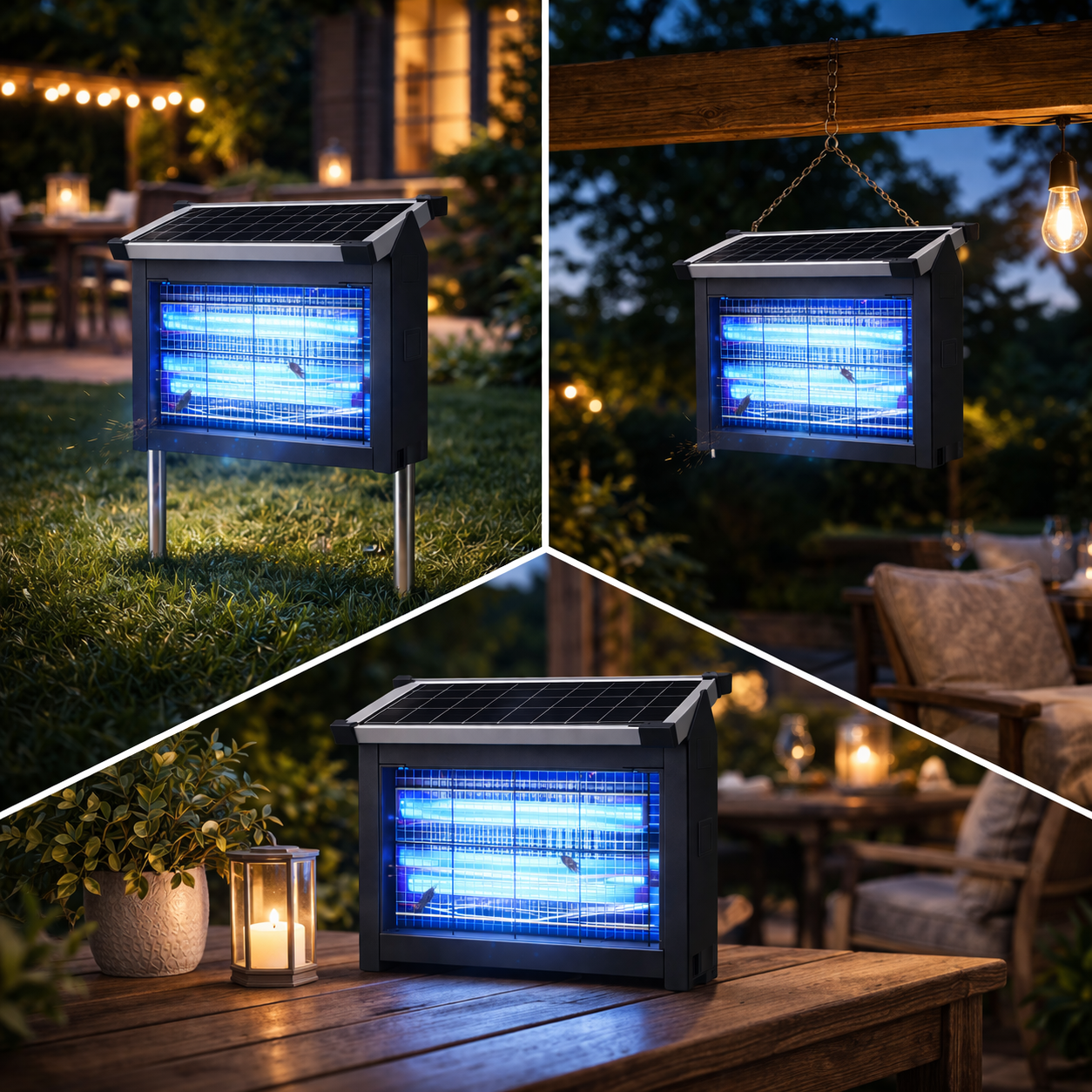 Real customer photos from people using the Solar Bug Zapper in patios, gardens, garages, and outdoor spaces.